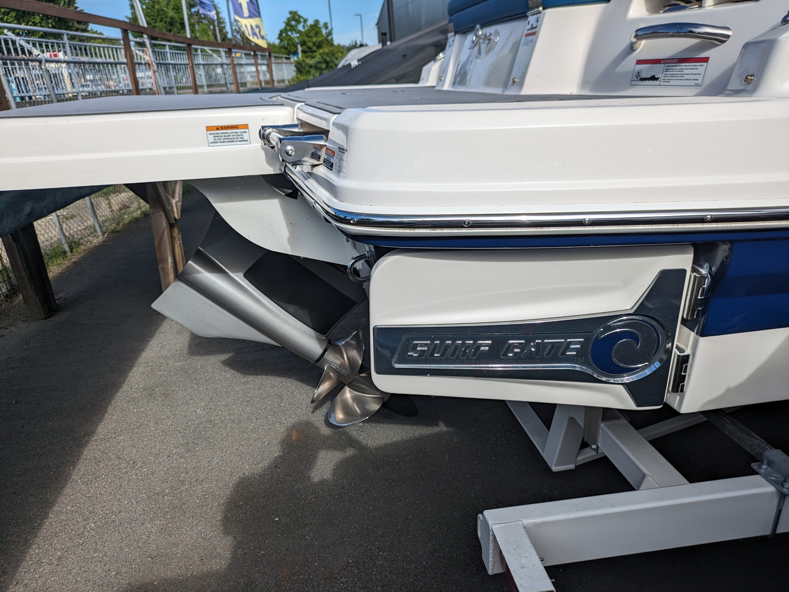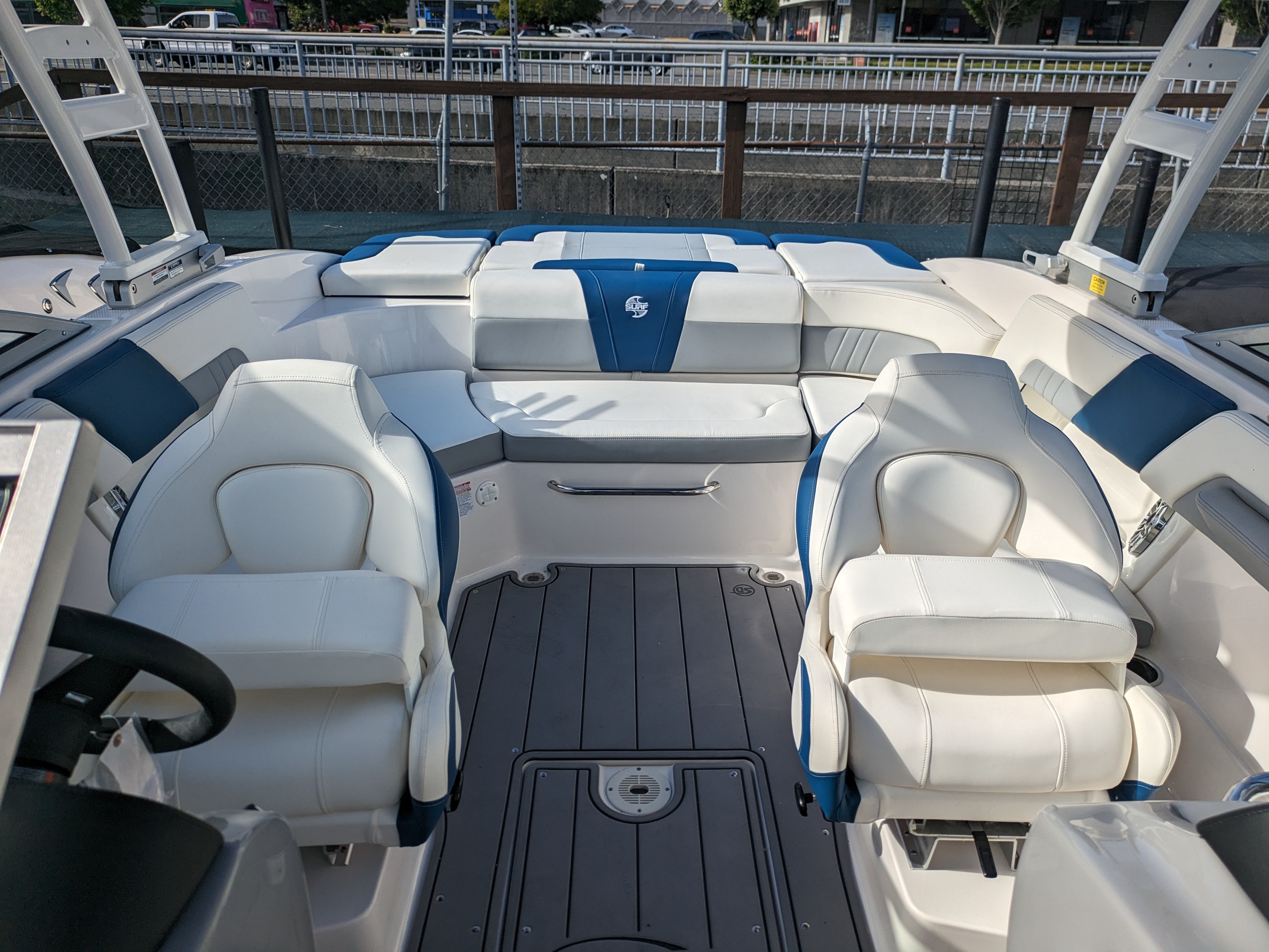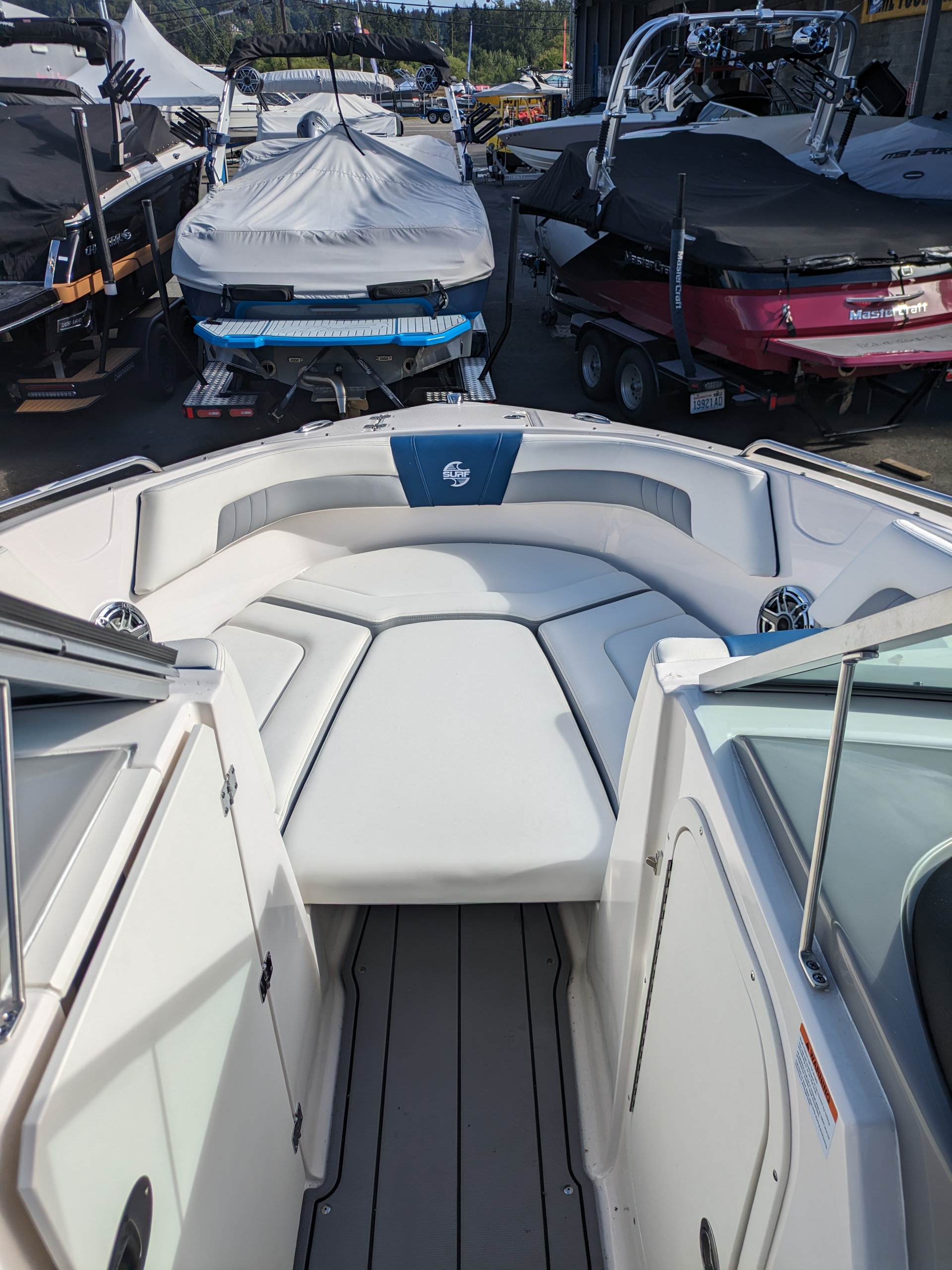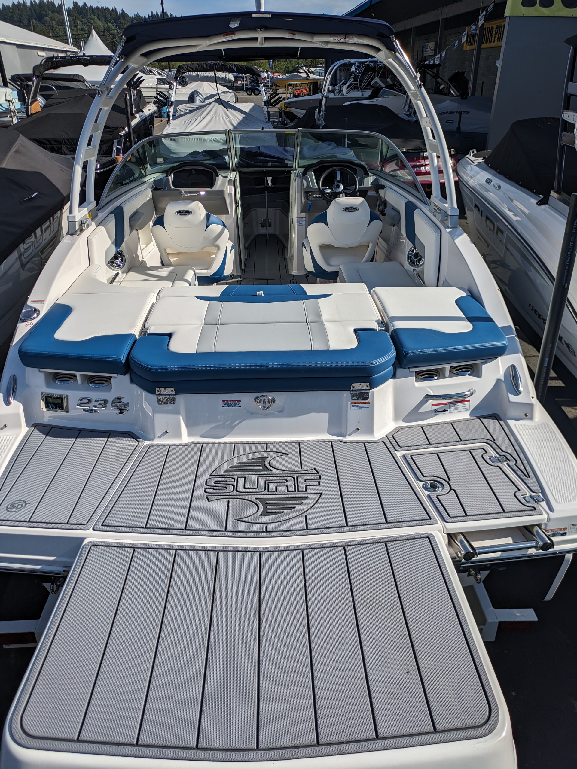 Endless wake, endless fun. This pre-owned 23 Surf combines everything you love about the line with the excitement of the Surf series. Wakesurfing is more thrilling and easier to enjoy than ever, thanks to the Malibu Surf Gate™ that lets you instantly adjust your wake – no repositioning necessary! Powered by Volvo EVC 300 hp forward facing drive, the 23 Surf features a Simrad touchscreen display that makes controlling your ride easy and straightforward. One thing is for sure: if you’re not already a wakesurfing enthusiast, the 23 Surf is sure to turn you into one. Stock boat is Dark Blue Wide Band.