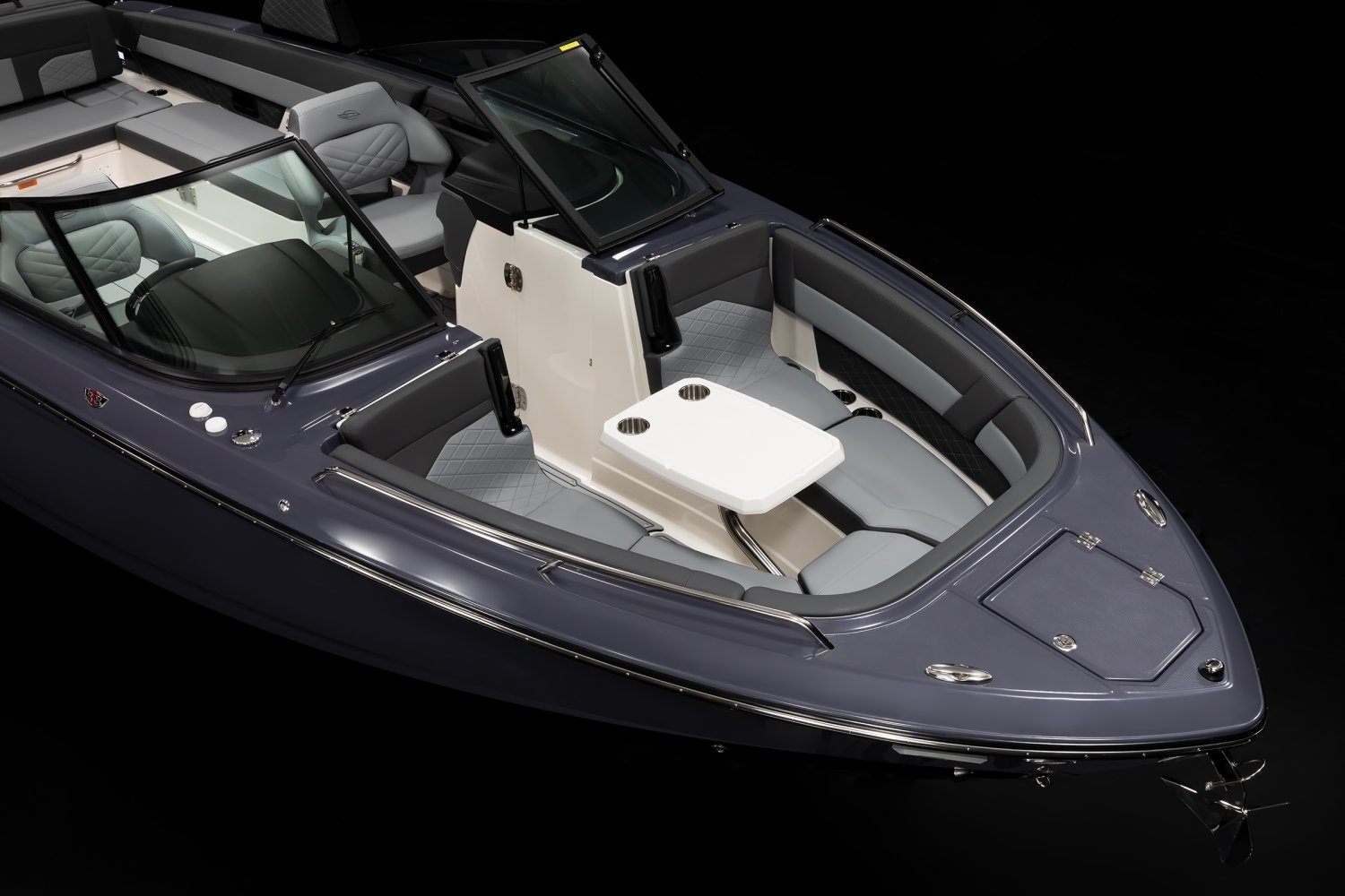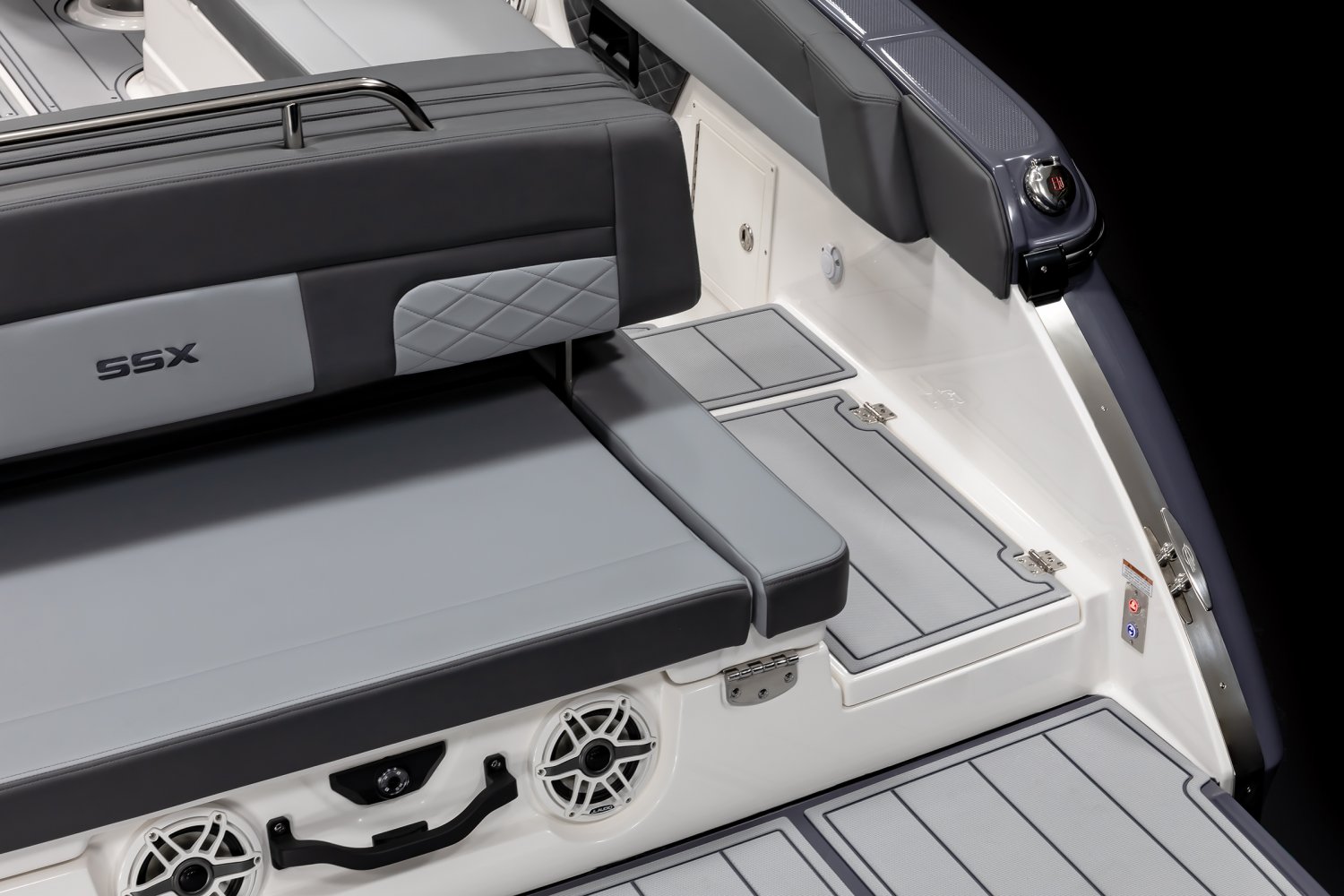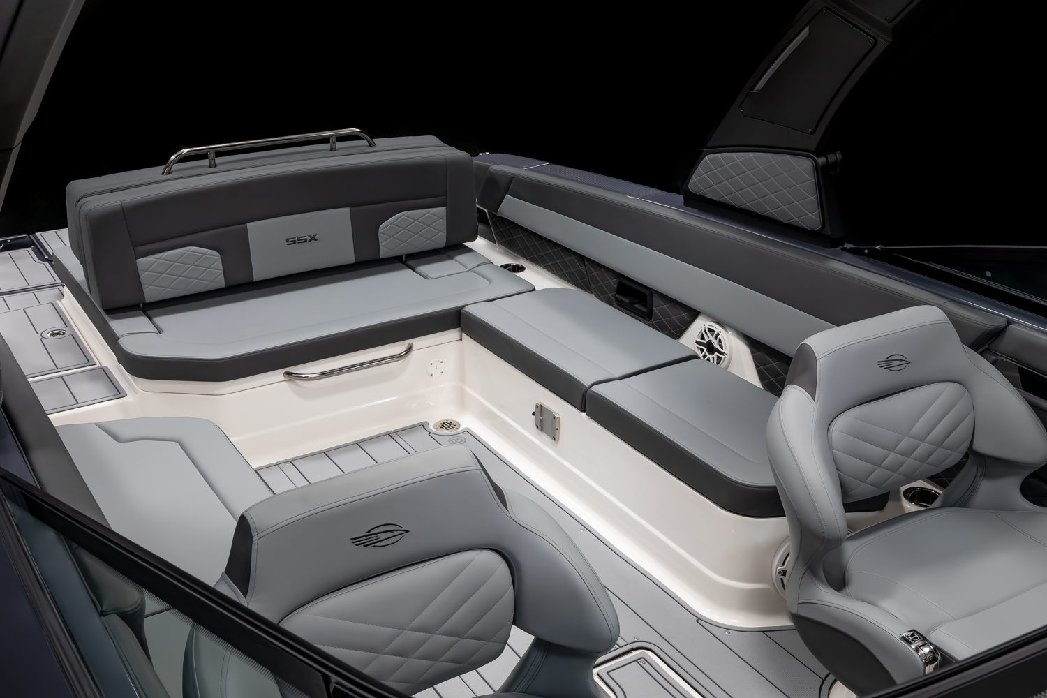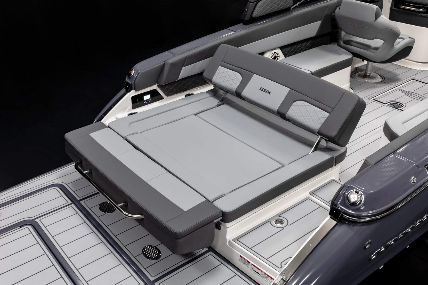 The SSX 30 stands out as a leader in design, performance, and functionality. As the largest model in the SSX stern-drive line, it combines power with agility and responsiveness. The helm is equipped with the latest touchscreen technology, while the cockpit is open and spacious, featuring a multi-position sun lounger. With a 9-foot beam, the cockpit offers ample space extending all the way to the bow area, which includes hinged storage beneath luxuriously appointed upholstery. Additionally, the standard Infinity Power Step swim platform makes enjoying water activities effortless.