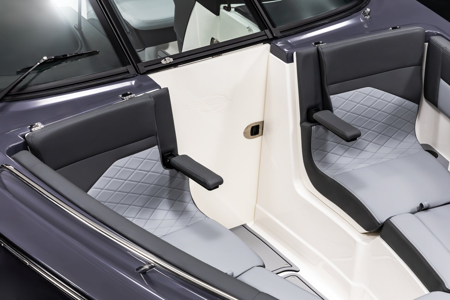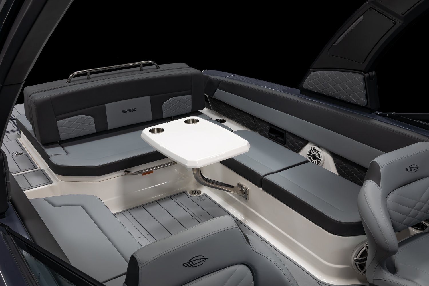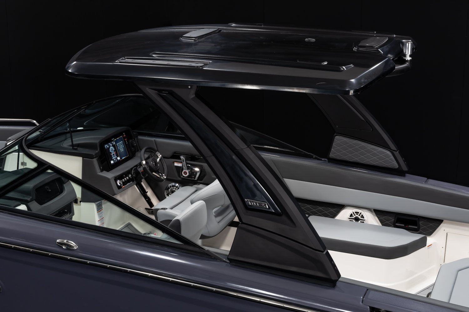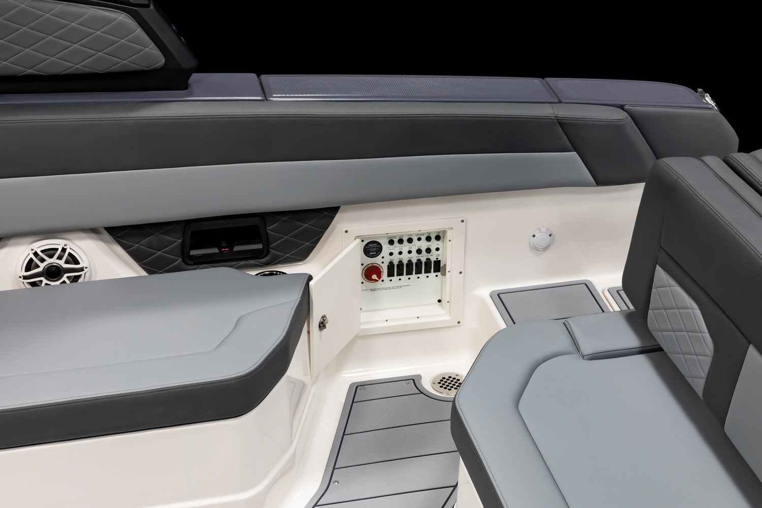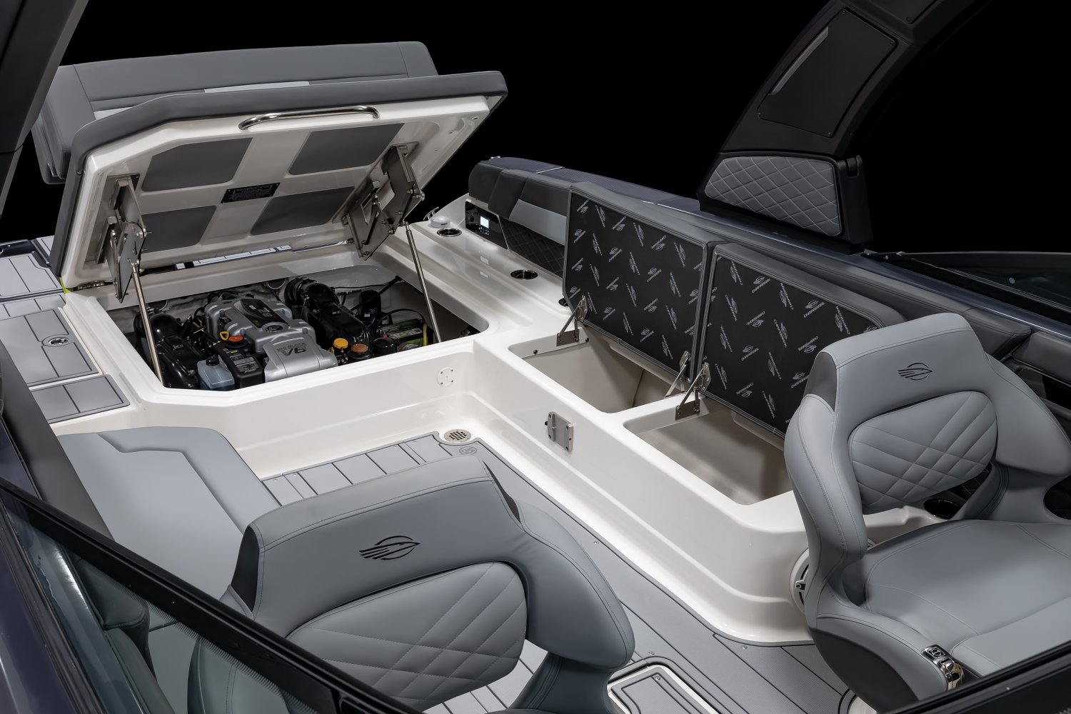 The SSX 30 stands out as a leader in design, performance, and functionality. As the largest model in the SSX stern-drive line, it combines power with agility and responsiveness. The helm is equipped with the latest touchscreen technology, while the cockpit is open and spacious, featuring a multi-position sun lounger. With a 9-foot beam, the cockpit offers ample space extending all the way to the bow area, which includes hinged storage beneath luxuriously appointed upholstery. Additionally, the standard Infinity Power Step swim platform makes enjoying water activities effortless.